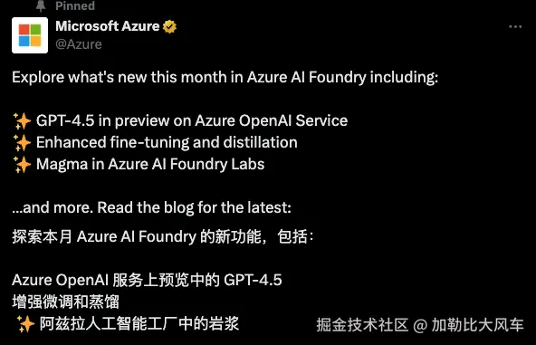 Azure 是微软推出的云计算平台,提供了各种各样的服务,其中就包括 AI 服务。作为OpenAI的投资方之一,微软的 Azure AI Foundry 也是同步上线了 GPT-4.5。