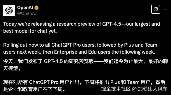这周 AI 圈真是热闹非凡,DeepSeek 的开源周搞得风生水起,而 OpenAI 终于也坐不住了,在开源周的最后一天放大招,发布了他们的新一代模型——GPT-4.5!