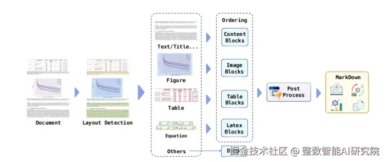 相比于网络爬虫数据,文档数据通常有更加规整的格式、主题集中、表达方式也更加一致。但是不同的文档有不同布局标准,或以质量不一的扫描图像的形式存在,使得通过文档转换建构数据集同样具有挑战性。为此,M-A-P 团队设计了一个专门的管道,以获取文档中的高质量数据文本。文档转化的 Pipeline 主要聚焦于两个核心问题:1. 分析布局信息,识别不同的布局元素;2. 识别这些布局组件之间的关系。