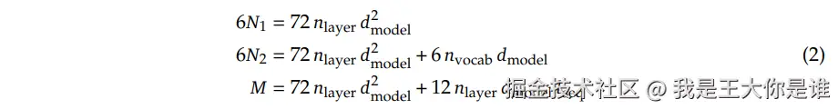 - 为了减少这些错误,我们引入了一种新的模型规模表示:非嵌入FLOPs/token M ,M 包括注意力操作的运算开销,但不考虑词汇表的计算。使用 M 表示模型规模,计算预算 C 可以简单地表示为C=MD。 、 和 M 之间的具体差异如以下公式所示
