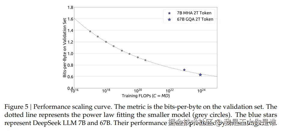 - 此外,我们根据计算预算 C 和最佳泛化误差拟合了损失缩放曲线,衡量标准是验证集上的每字节比特数,并预测了DeepSeek LLM 7B 和 67B 的泛化误差,如图5所示。结果表明,使用小规模实验可以准确预测具有 1000 倍计算预算的模型的性能。
