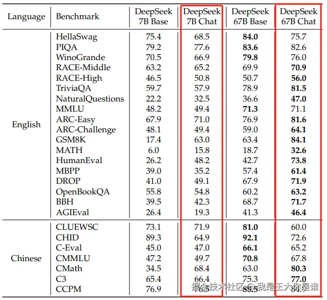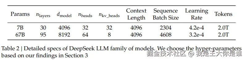 - 与大多数使用分组查询注意力(GQA)的模型不同,我们扩展了 67B 模型的网络深度参数,而不是常见的增加 FFN 层的中间宽度,以追求更好的性能,见下表: