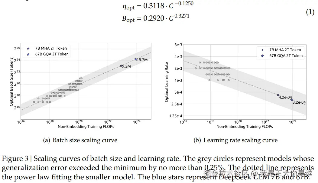 - 我们利用前面提到的多步学习速率调度器,通过重复使用第一阶段的方式,有效地训练了不同批量大小、不同学习率、计算规模在 1e17 到 2e19 的多个模型 。考虑到参数空间中的冗余,我们将模型使用的参数视为接近最优的超参数,其泛化误差不超过最小值的0.25% 。然后,我们根据计算预算 C 拟合批次大小 B 和学习率 n 。拟合结果如图3所示,