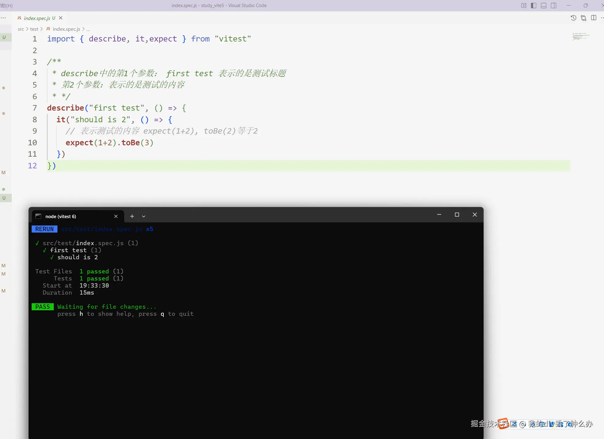 // 表示测试的内容 expect(1+2), toBe(2)等于2