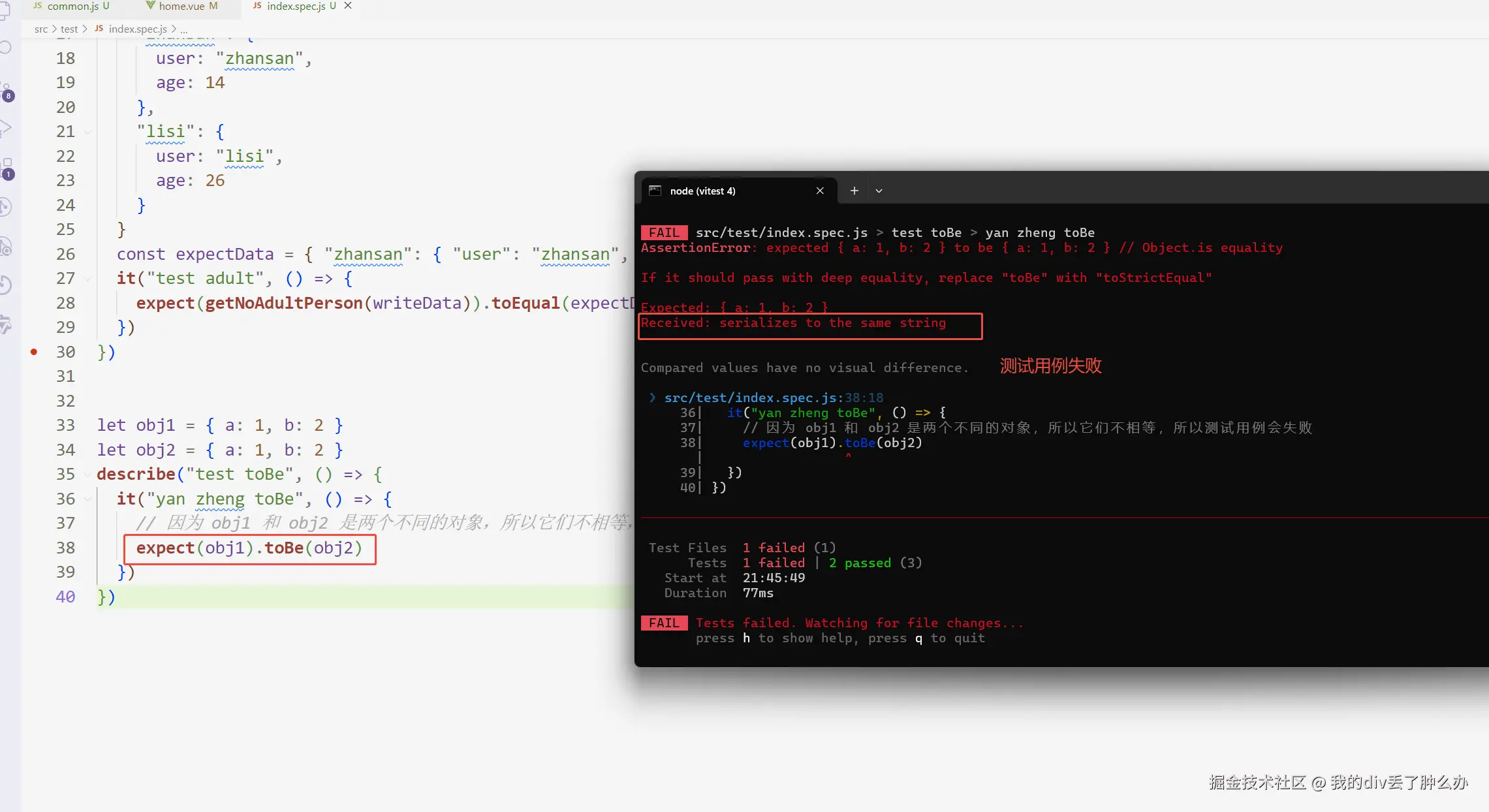 比如:两个不同的对象,如果属性值都相同。用toEqual会通过,而toBe不会。