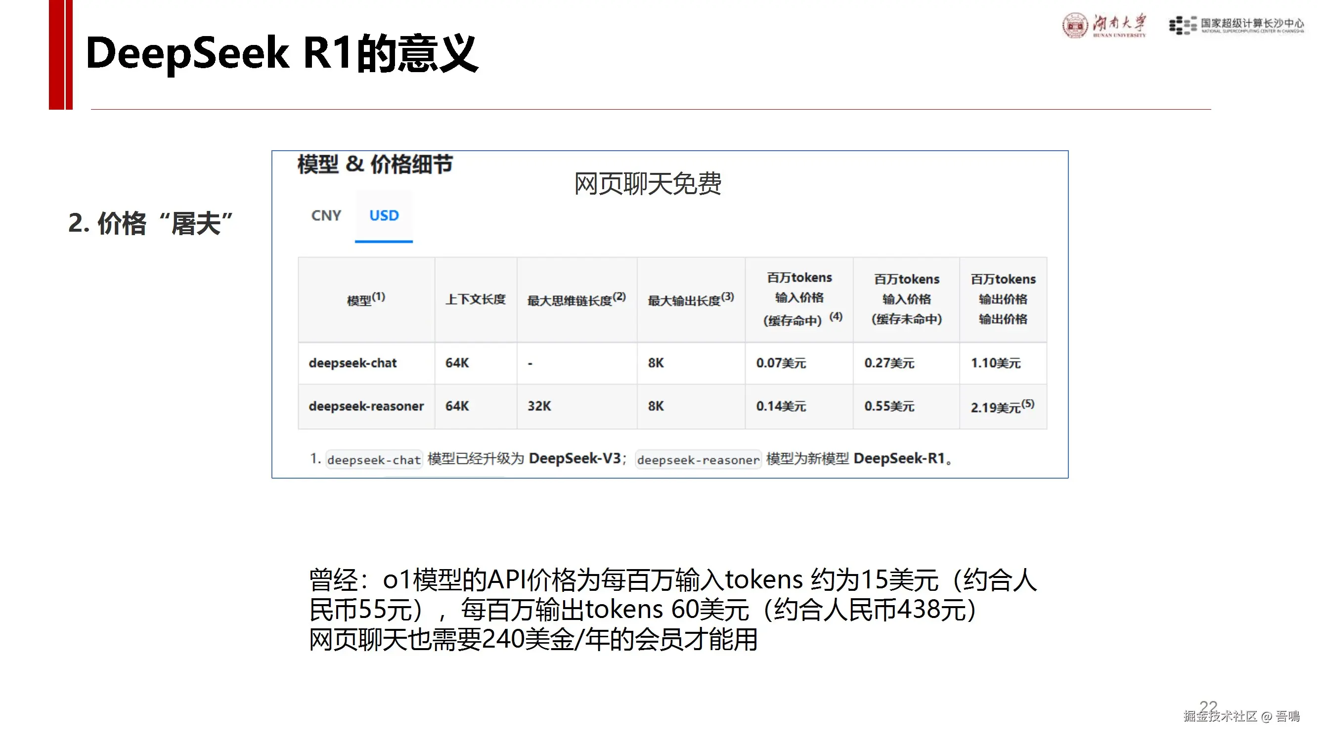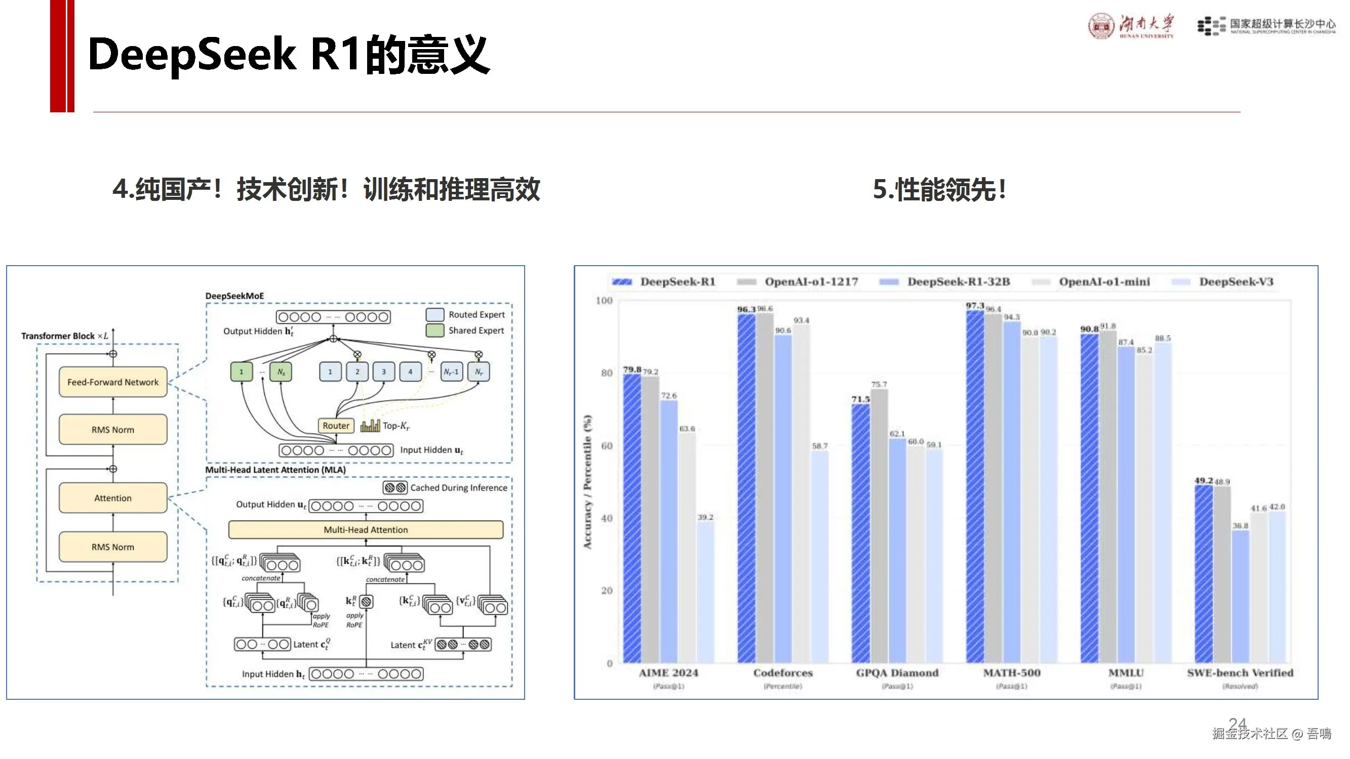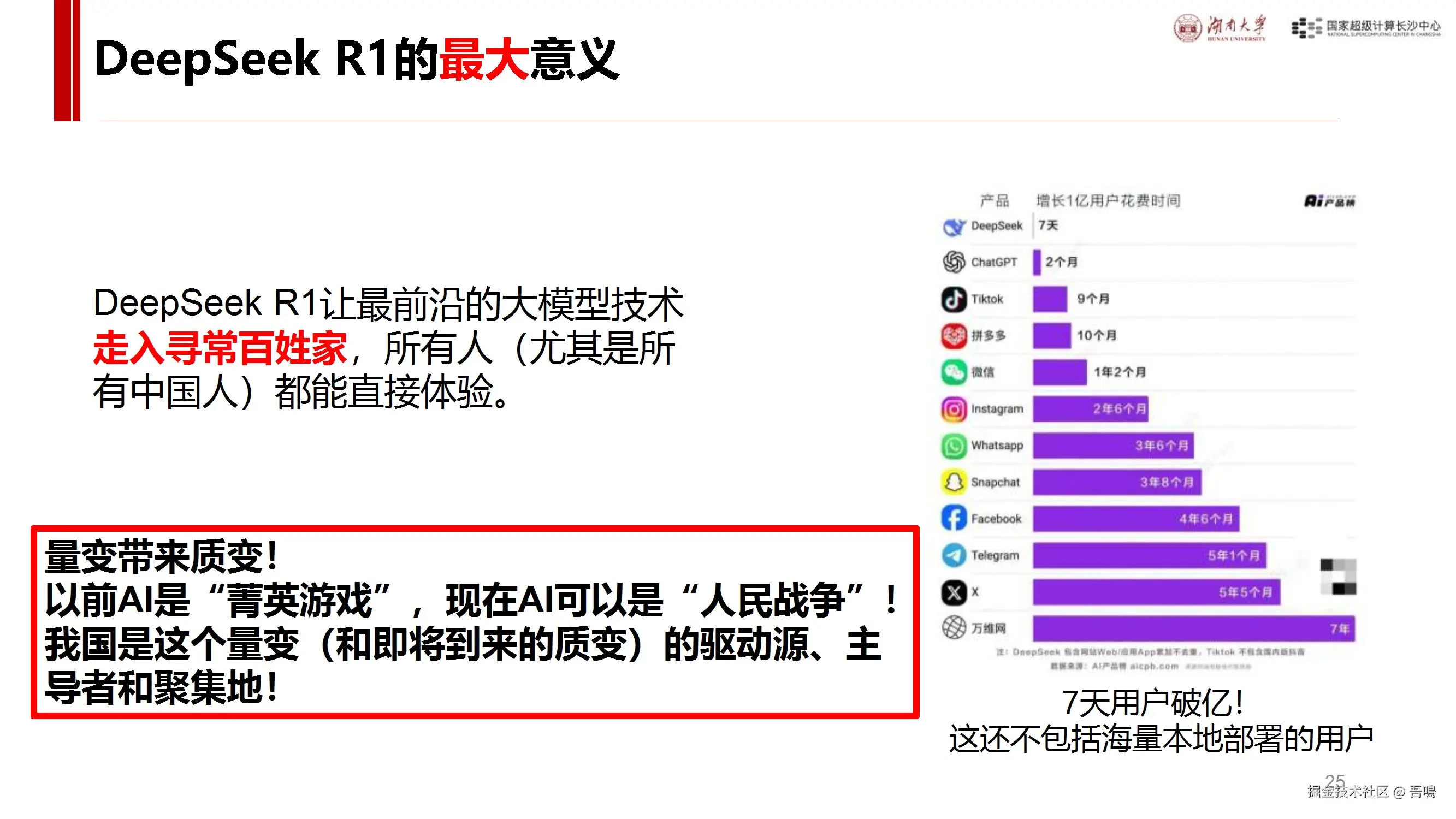 从ChatGPT的突破谈起,引出DeepSeek-R1的独特价值,包括其作为首个展示思维链的推理模型、价格优势(大幅降低使用成本)、开源特性(支持本地部署)、纯国产技术创新及性能领先。重点强调其通过高效训练框架和推理优化,使大模型技术普及化,推动“量变引发质变”,例如7天用户破亿的爆发性增长。