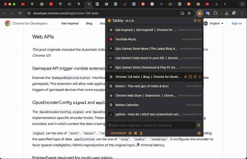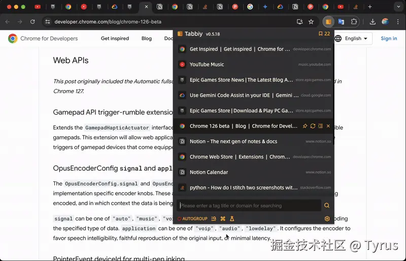 浏览器标签页打开过多,标签栏杂乱无章,查找信息费时费力,严重影响浏览体验和工作效率。别担心,Tabbiy 这款专为 Chrome 浏览器打造的扩展程序,可帮助您轻松管理浏览器标签,将为你彻底解决这些烦恼!通过自动分组、搜索、快捷切换、标签休眠释放内存等功能,提高效率且改善浏览体验。