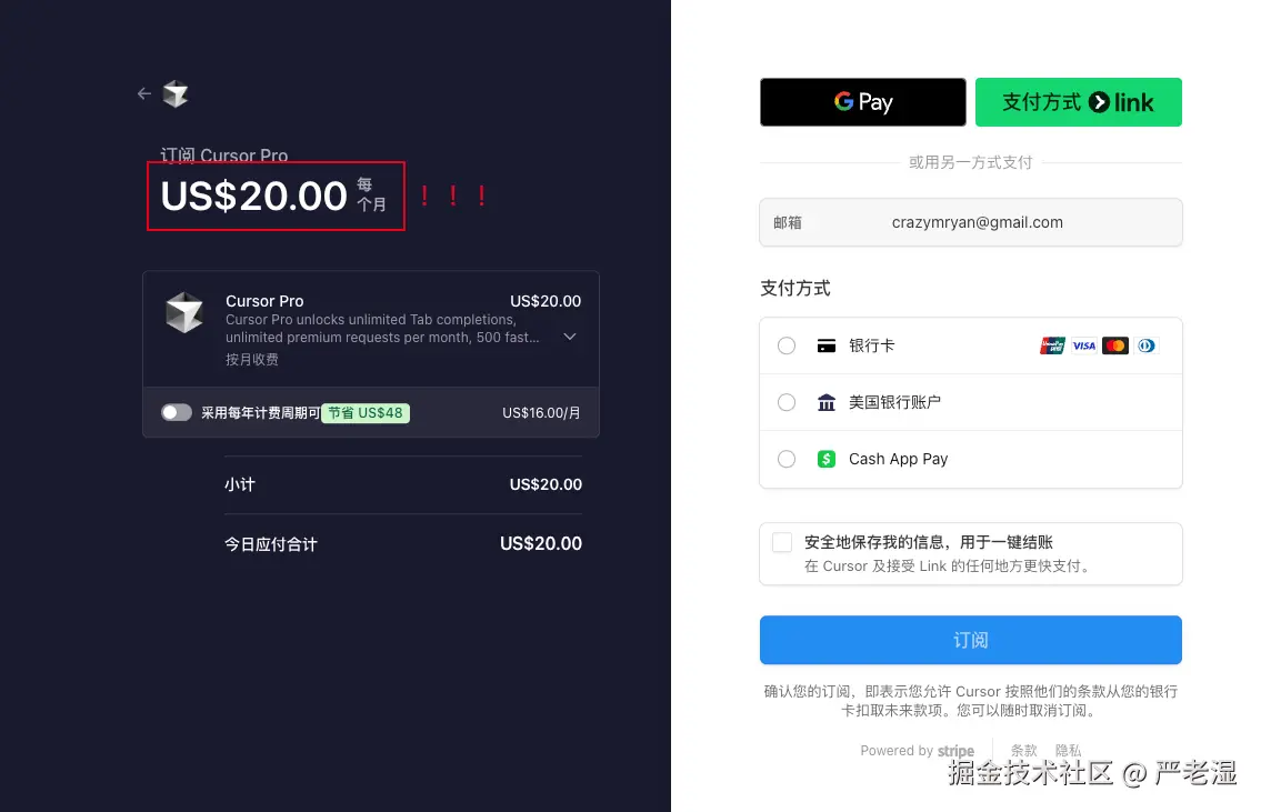 本文主要给大家讲解下如何薅 Cursor 的羊毛。如图 $20 一个月还是有些许心疼的。
