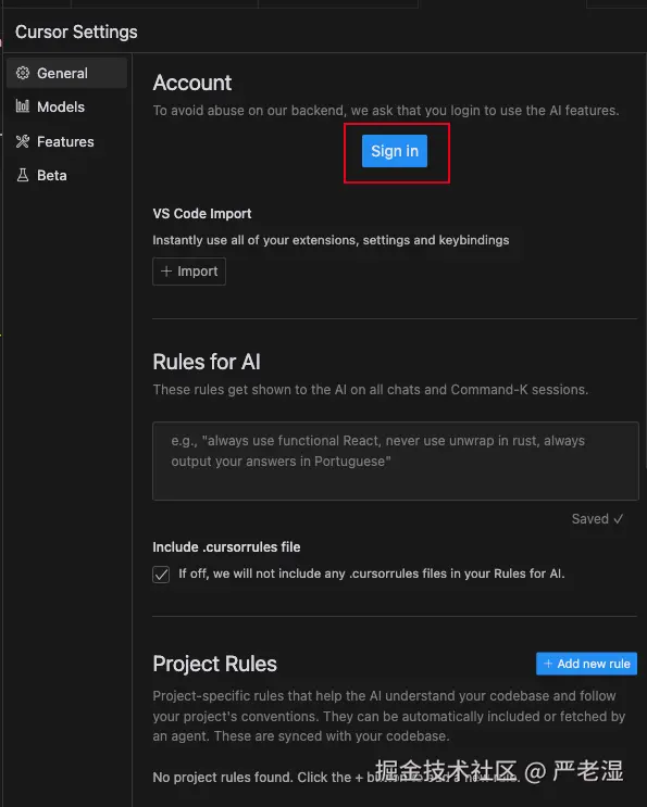 继续打开 Cursor 编辑器,找到 Setting 图标,点击 Sign in,进行登录。