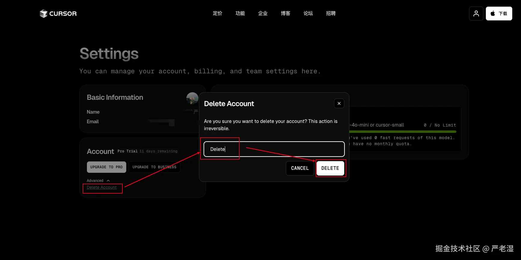 注意这里有个 Delete Account (删除账户)按钮