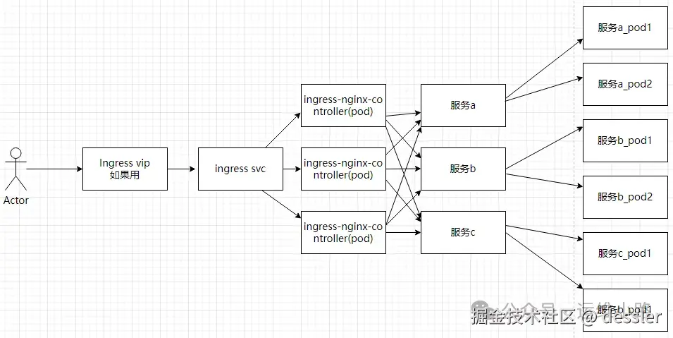 从日志上来,无论我们删除还是增加操作,ingress-nginx-controller都能及时感知到,并动态增加,删除或者更改nginx的配置来实现我们的需求。另外如果你的所有流量都通过ingress来实现,那么ingress的压力会很大,需要合理考虑副本数量,以及日志大小的问题。当前版本ingress的日志是通过标准输出来实现的,标准输出的日志依赖Docker自动轮询,如果未配置,则这个日志可能会很大(生产环境见过最大的3T)。下图就是使用了ingress的流量走向。
