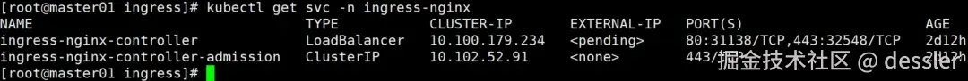 默认的ingess配置的svc,使用的LoadBalancer,但是由于我这个测试环境目前不具备LoadBalancer的能力,所以这里个地方的EXTERNAL-IP还处于pending状态。真正的生产环境这个地方一般都需要解决的。由于我这里只是为了演示,所以我这里就使用ClusterIP进行验证。