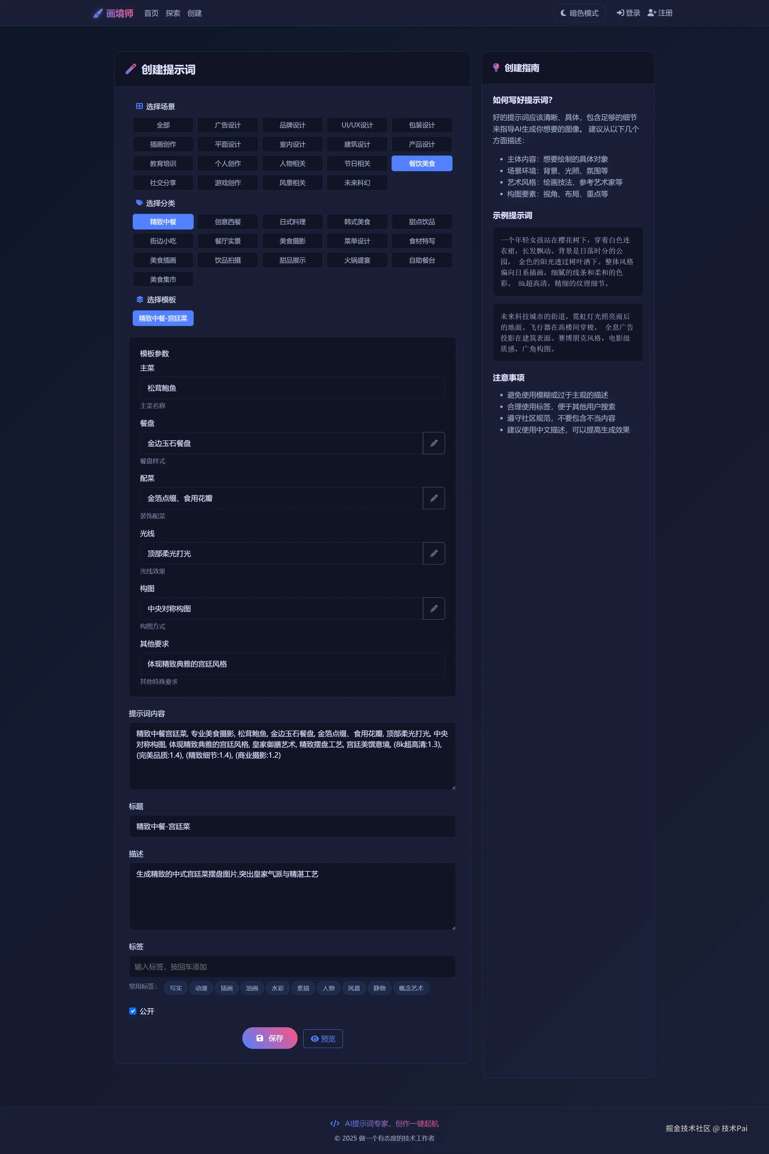 一个基于Python+Flask的AI绘画提示词生成与优化系统,帮助用户轻松生成高质量的AI绘画提示词。系统提供智能分析、专业规则优化、多场景模板等核心功能,并内置基于用户行为的智能推荐系统。此外,系统还包含完整的用户中心和社区互动功能,支持提示词和模板的分享与收藏,是一个功能完整的AI绘画辅助工具。