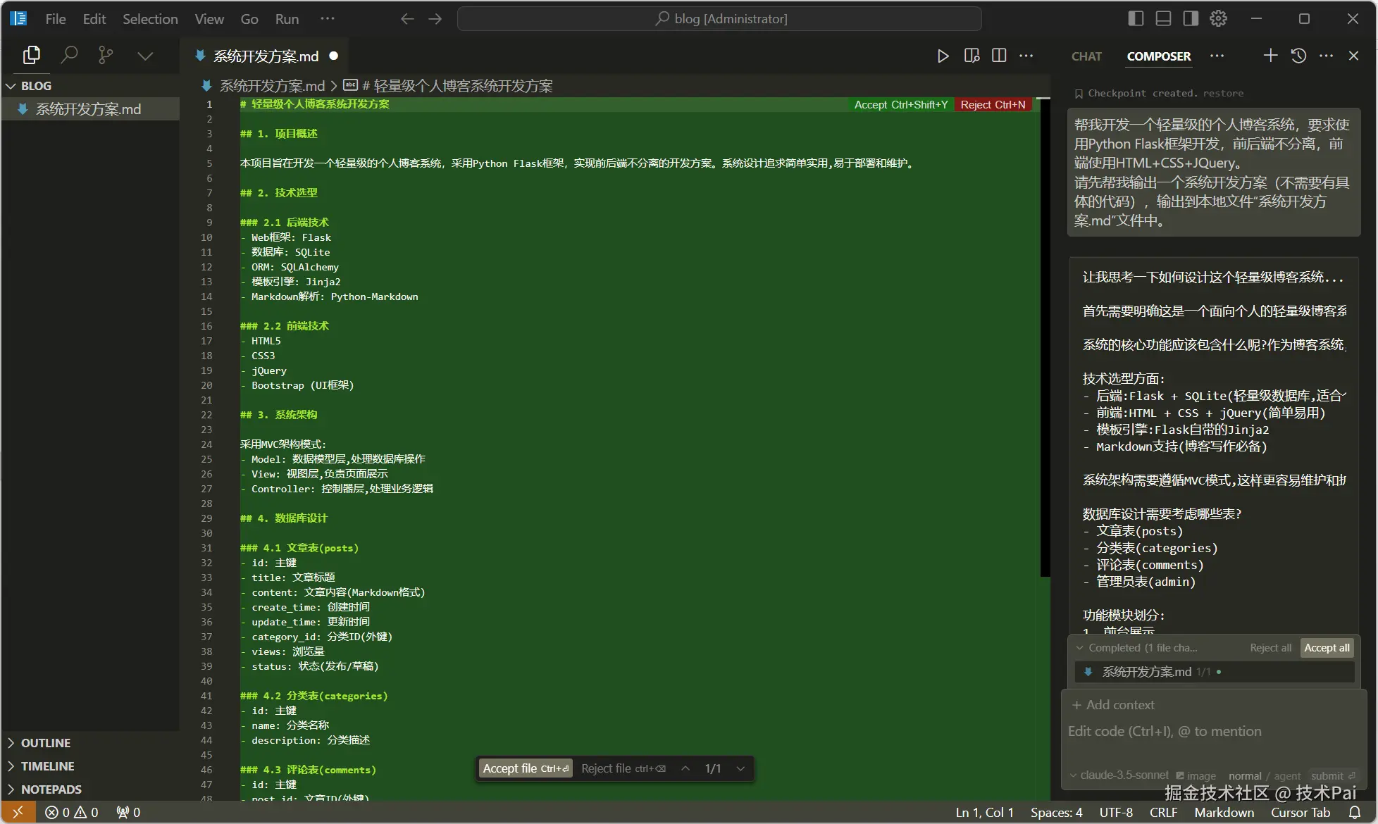帮我开发一个轻量级的个人博客系统,要求使用Python Flask框架开发,前后端不分离,前端使用HTML+CSS+JQuery。请先帮我输出一个系统开发方案(不需要有具体的代码),输出到本地文件“系统开发方案.md”文件中。