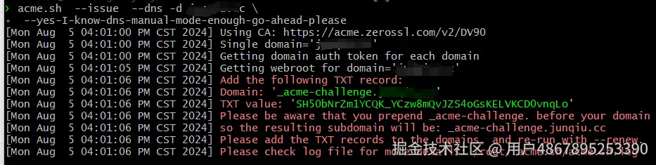 ipconfig /flushdns和nslookup -qa=txt _acme-challenge.www.example.com)上手工检查域名txt记录的更新情况; - 域名记录未清空,还存在TXT记录。如果第一次不成功,要等待TTL时间再试,因为acme.sh将添加相同的二级域名(