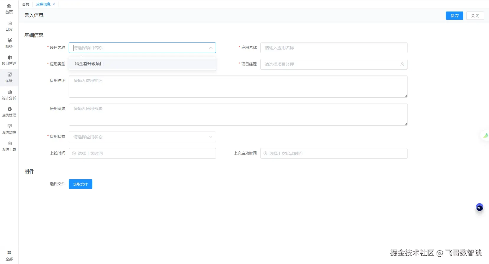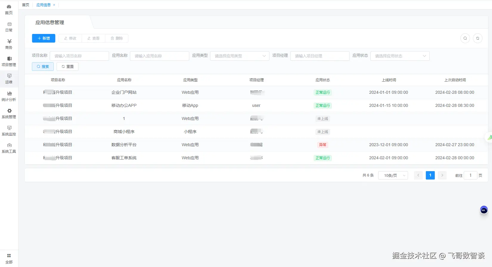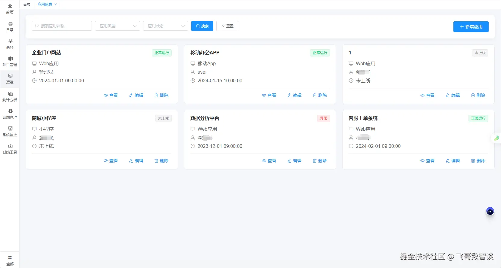 - 实现应用信息的基础管理(增删改查),包括:关联的项目、所用资源(服务器等)、项目经理、应用名称、应用描述、应用类型(Web、App、小程序)、应用描述、应用状态(未上线、正常运行、异常)、上线时间、上次启动时间、备注。
