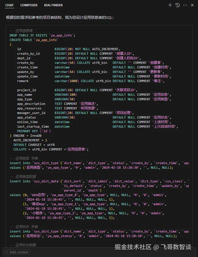 上下文选择“应用”的建表sql,使用Composer模式,后续一直使用该模式。