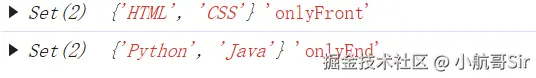 对称差集,返回两个集合中所有独一无二的数,如下 HTML CSS 和 Python Java 是各自里面的独一无二的数