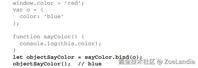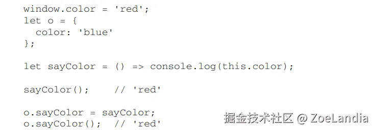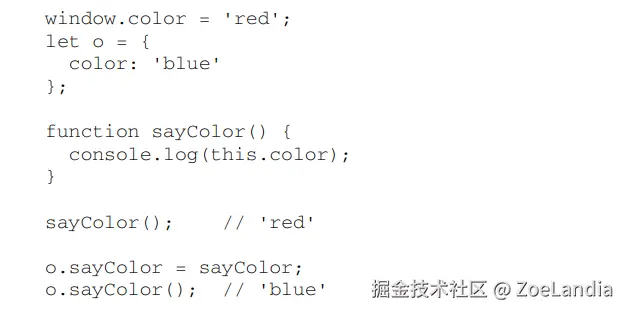 定于在全局上下文中的函数 sayColor() 引用了 this 对象,这个 this 到底引用哪个对象必须到函数被调用时才能确定,因此这个值在代码执行的过程中可能会变。在全局上下文中调用 sayColor(),this指向window,this.color 相当于 window.color;而把 sayColor() 赋值给 o 之后再调用,this 会指向 o