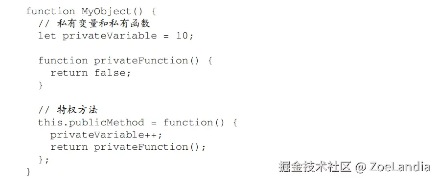 特权方法也可以通过使用私有作用域定义私有变量和函数来实现,比如以下: