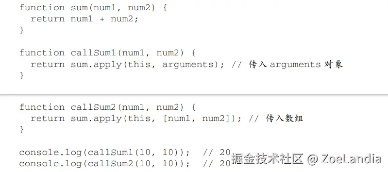apply() 接受两个参数:函数内 this 的值和一个参数数组,第二个参数可以是 Array 的实例,也可以是 arguments 对象