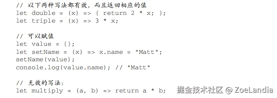 箭头函数不能使用 arguments、super 和 new.target,也不能用作构造函数。此外,箭头函数也没有 prototype 属性
