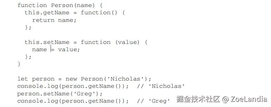 这段代码中的构造函数定义了两个特权方法:getName() 和 setName(),每个方法都可以构造函数外部调用,并通过它们来读写私有的 name 变量