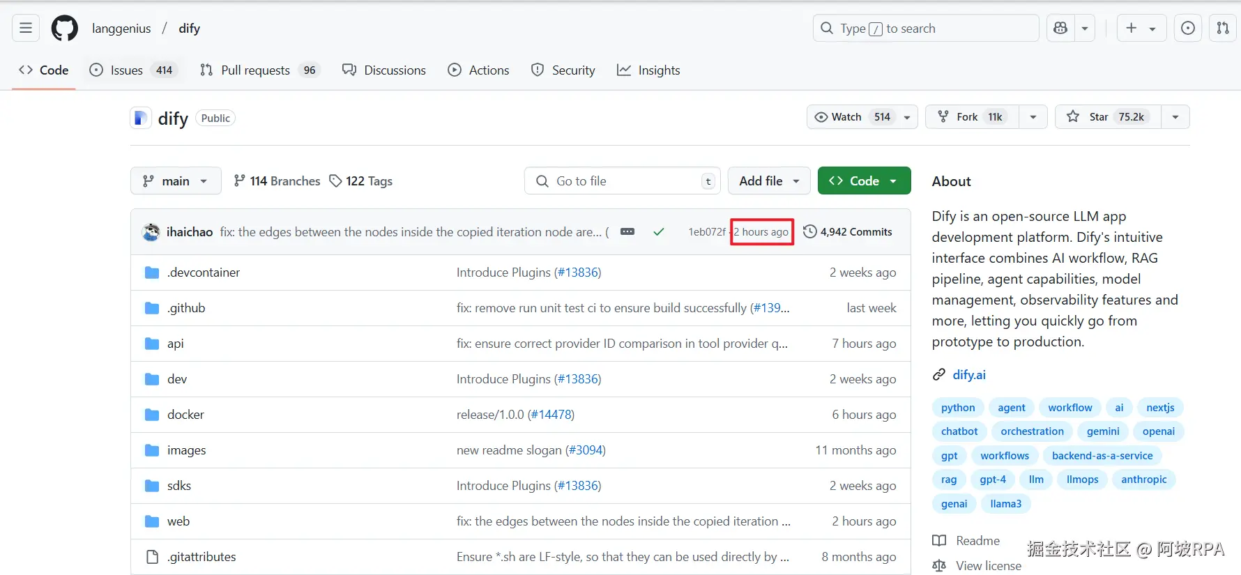 我到github官方仓库一看,原来Dify更新版本了,并且是大版本更新,且仓库刚更新不久,还是热乎的: