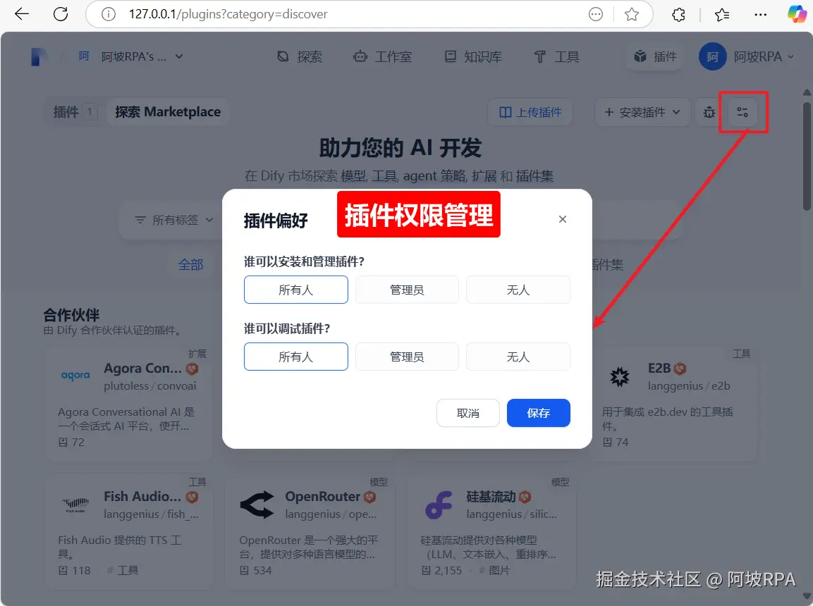 权限管理,也是很多人对的需求,比如,开发的插件涉及有高敏感操作,只想对团队管理员开放,其他人不能使用,此时就可以用上插件的权限管理功能:
