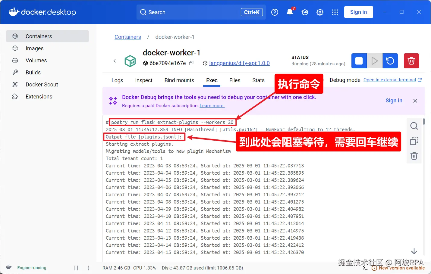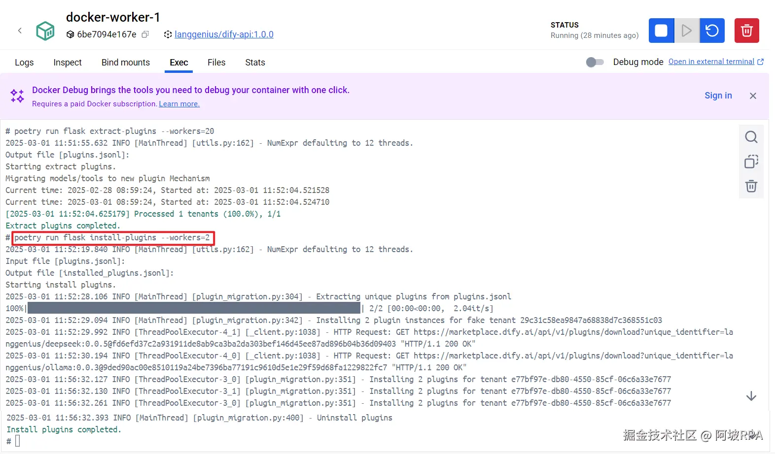 此处需要确保你的网络(如果失败,就用魔法)正常运行,并且可以访问 marketplace.dify.ai,然后运行以下命令,操作方法同上: