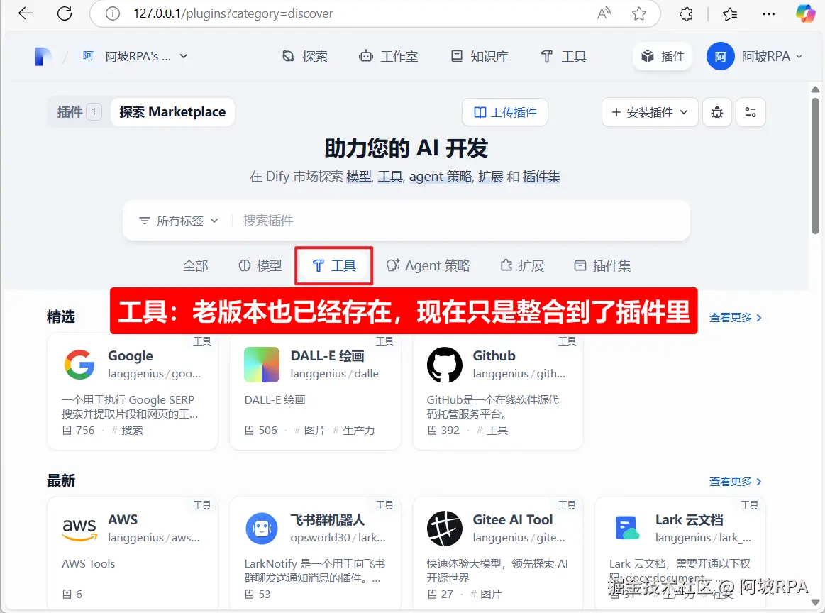 可以看到Dify的插件,囊括了很多种类型:模型,工具,Agent策略,扩展
