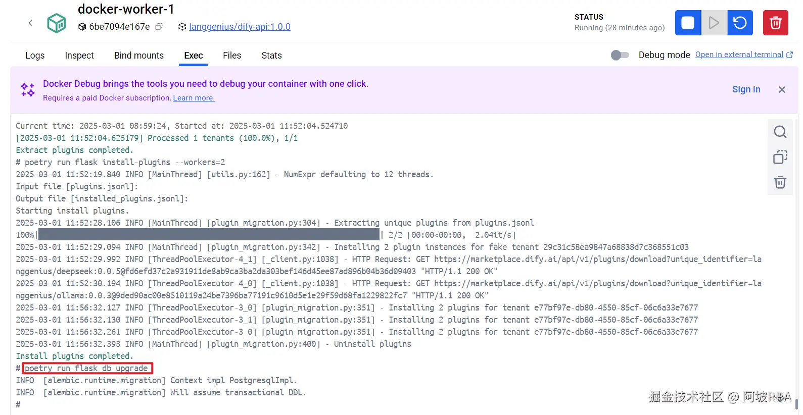 在完成基本的插件安装过程后,按照标准的 Dify 升级程序更新数据库架构到最新版本: