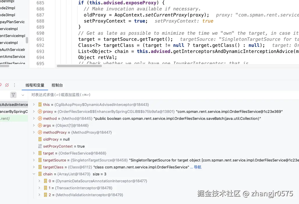请关注chain变量,里面包含3个拦截器,更重要的是动态数据库切换的拦截器在事务拦截器前面,而我们的目的不就是在事务开启前切换数据库吗,那我现在的问题就是我的切面类在事务后执行的,所以调整我的切面类执行优先级就好了,立马把Order注解抬上来,执行程序完美运行。