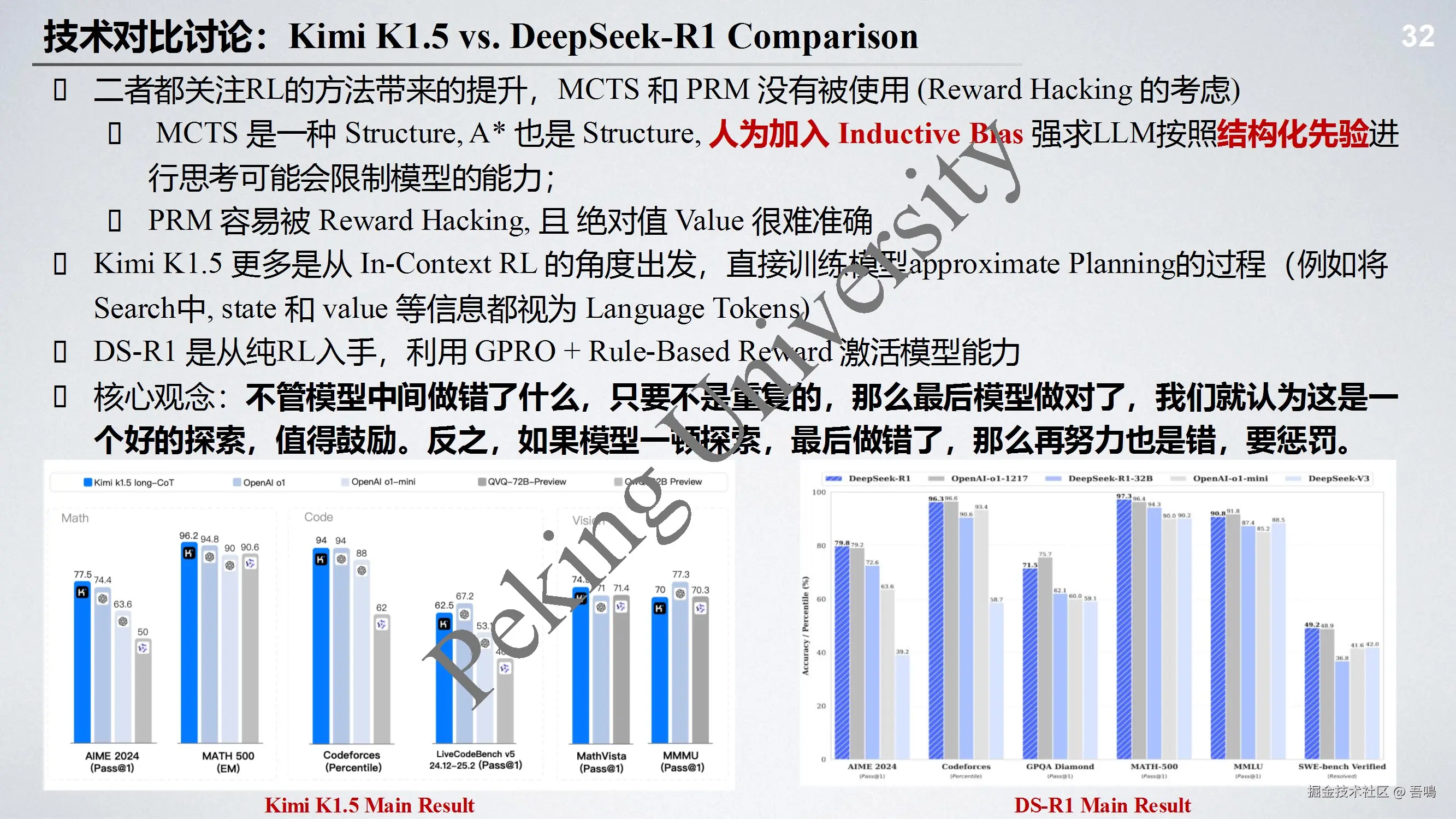 对比了不同技术路线,如基于STaR的方法与RL方法的差异,蒸馏与RL的优劣,以及MCTS和PRM的作用。例如,Kimi K1.5通过长文本思维链(Long-CoT)结合RL提升推理能力,而DeepSeek-R1更注重规则化奖励和基座模型的潜力激活。蒸馏可将大模型的高阶推理能力迁移至小模型,但在泛化性上受限。
