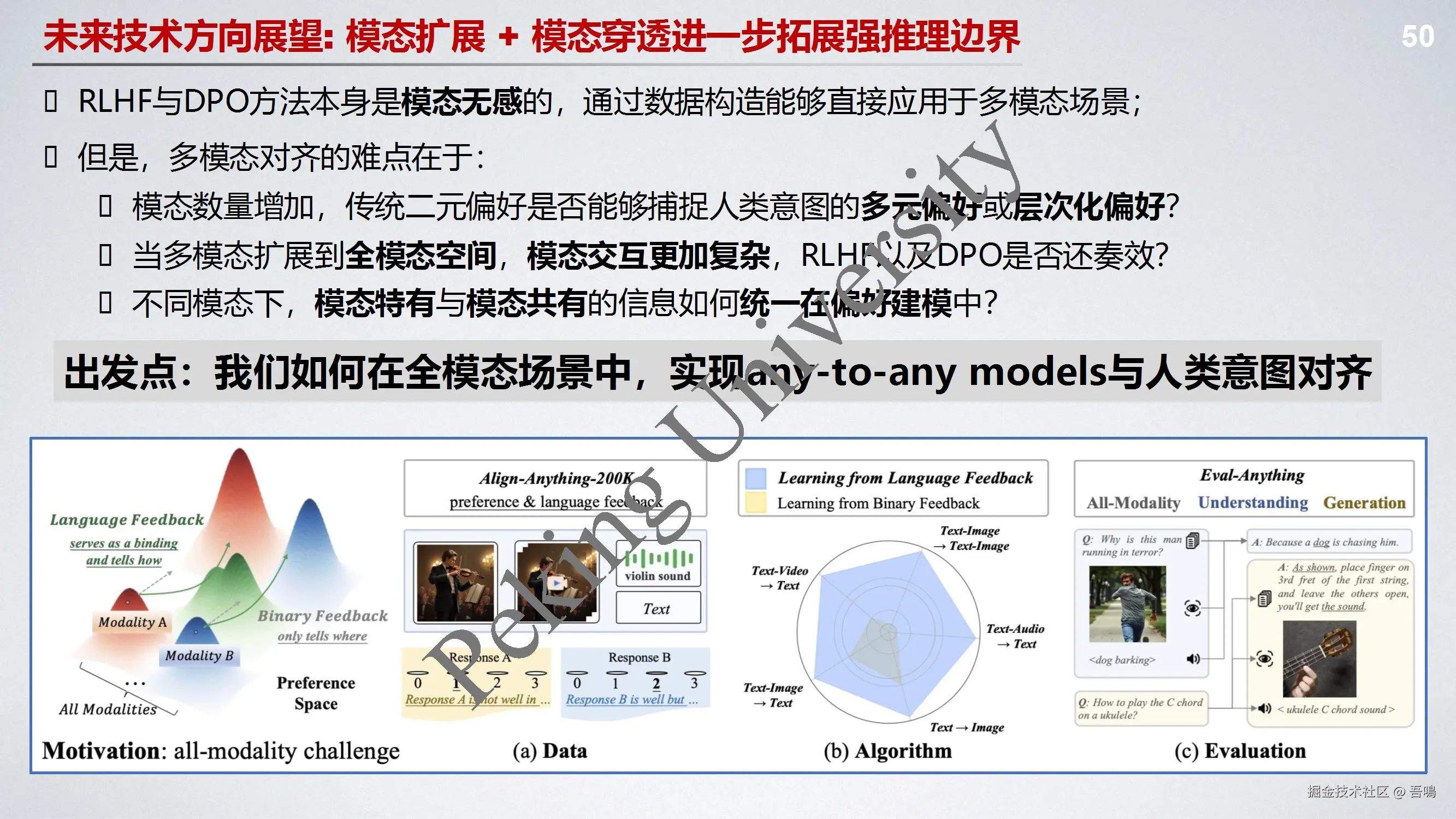 包括长思维链可解释性改进、强推理赋能智能体(Agent)发展、合成数据与测试阶段计算优化,以及全模态场景下的统一对齐方案(如Align-Anything框架)。强调通过形式化验证和RL结合提升AI系统的可靠性,突破算力限制的算法创新。