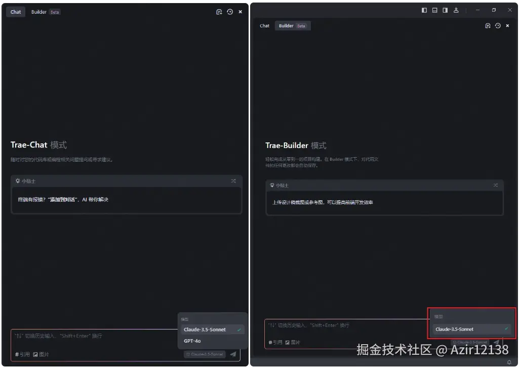 在Chat模式下可以选择Claude-3.5-Sonnet以及ChatGPT-4o的模型,但是在对标Cursor的Composer模式-Builder中目前只有Claude-3.5-Sonnet模型使用。