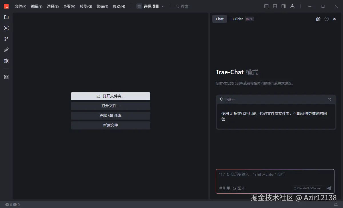 主界面长这样,跟VS Code一样,但是是整体页面的风格以及安装时就能选择中文这一点给他点个👍。在初始界面的右边,就是Trae和VS Code区分开来的地方了:一个AI对话框。