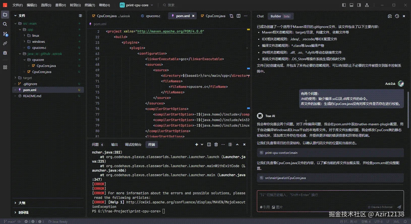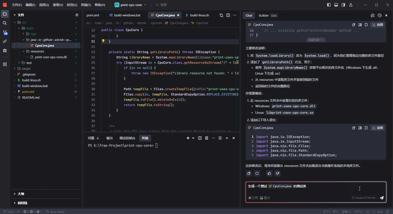一个Maven项目,groupId:io.github.azirzsk, artifactId:print-uses-cpu-core。提供一个API打印当前线程所使用的CPU核心,使用JNI并且需要兼容Windows和Linux系统。这个maven项目会被其他Maven项目所引用,所以需要考虑编译后的文件能否被引用。生成一个markdown文件,详细描述如何使用或者编译项目。
