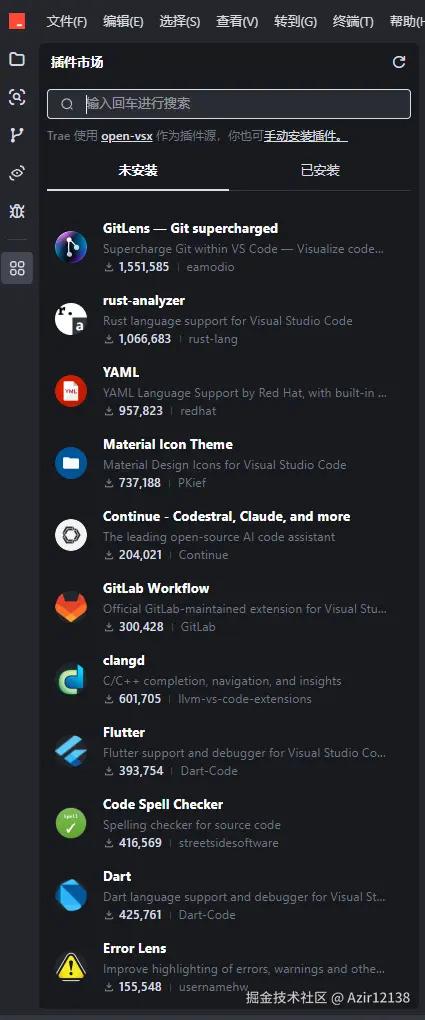 安装完成后,就去插件中心安装Java的开发插件。Trae的插件中心跟VS Code大差不差,还是那句话:不愧是大厂,UI就是好看!