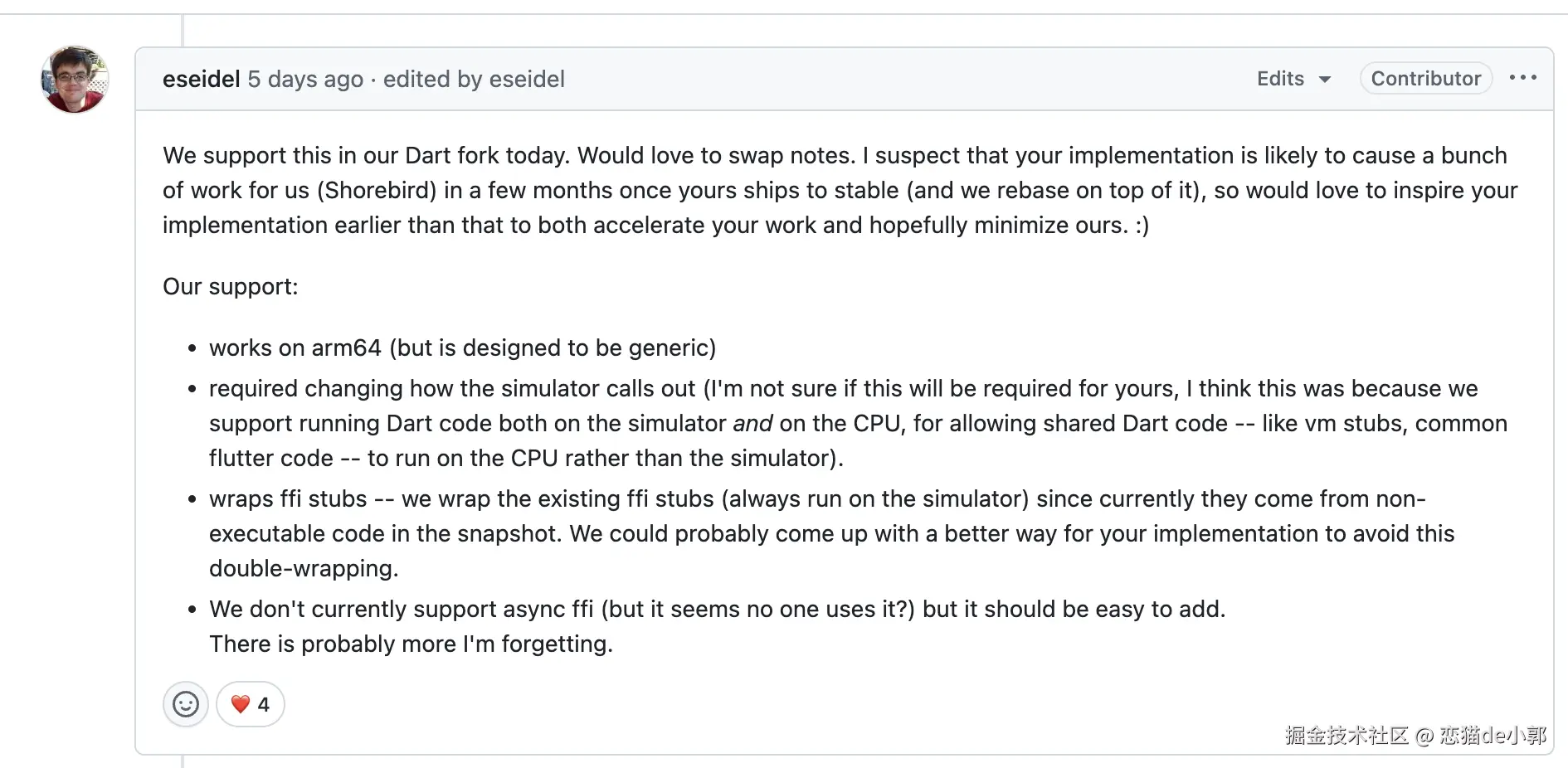 事实上,Eric 对于 Dart VM 这部分工作还是很“担心的”,毕竟 shorebird 作为分支方,这种修改合并无疑会给他们带来许多工作量,而如果 Dart 团队的方案能尽可能贴近 shorebird ,那就最好不过了: