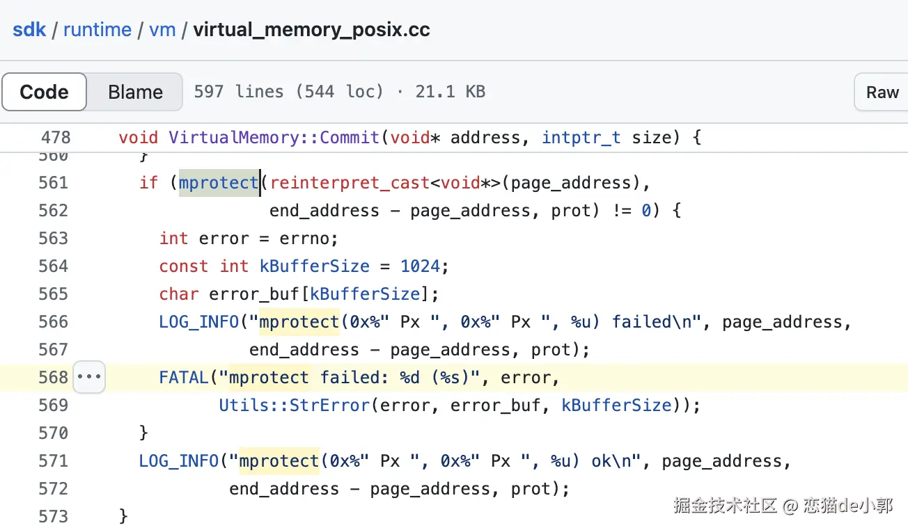 所以 Flutter 在 debug 运行时, JIT 运行的是一个未签名的二进制文件,并且需要直接 hotload ,也就是需要 Dart VM 在运行时根据 Kernel 二进制文件生成机械码,并且在可以接受 hotload 的热更新,所以它是通过 VM 来“解释”和“生成“,所以它会需要 mprotect 的系统调用。