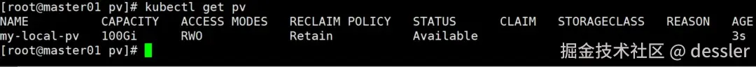 这个配置定义了一个名为 my-local-pv 的持久卷,具有 100Gi 的存储容量,卷模式为文件系统,访问模式为 ReadWriteOnce,回收策略为 Retain,并且指定了节点亲和性,使得该持久卷只能被调度到标签为 kubernetes.io/hostname=node01 的节点上。持久卷的本地路径为 /mnt/pv_disk