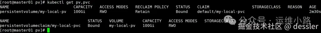 请确保my-local-pv是先前定义的PV的名称,以确保PVC与正确的PV绑定。当创建这个PVC时,Kubernetes将会使用指定的PV来满足PVC的存储需求,当PV和PVC的STATUS为Bound则算是可用使用的。