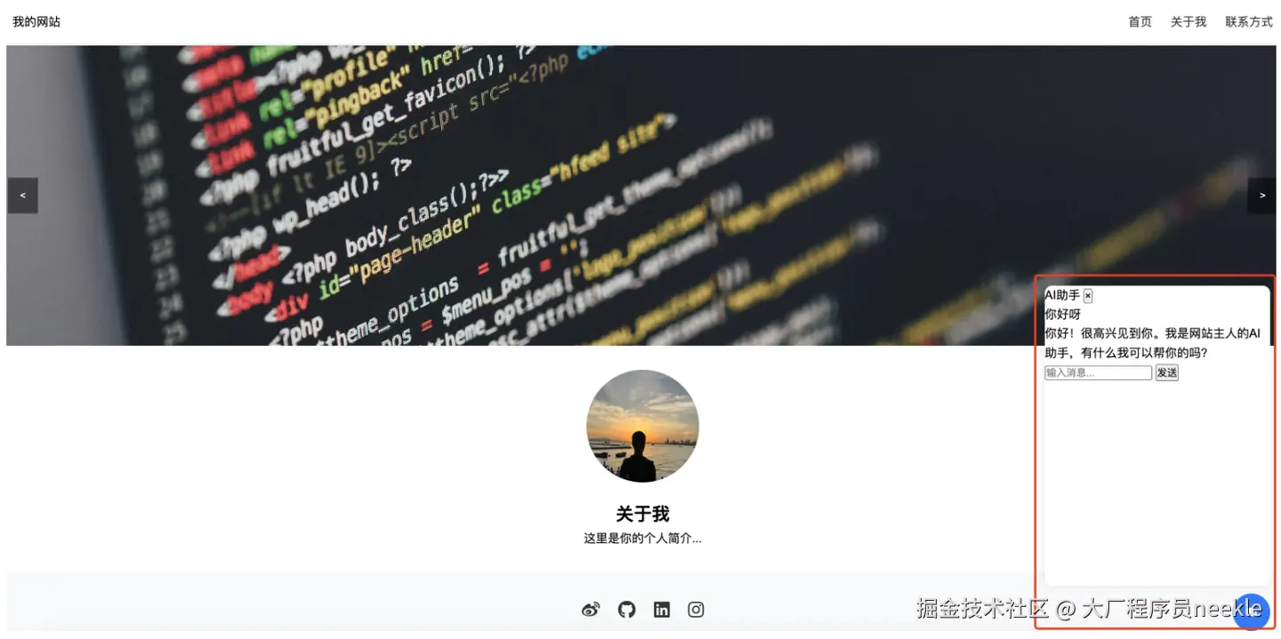 我想设计一个个人网站。主要用于展示自己的几张照片,提供自己的社交链接,同时还要一个AI小助手,来回答用户问题。请先帮我设计下,用文字描述下页面,先不用写代码。