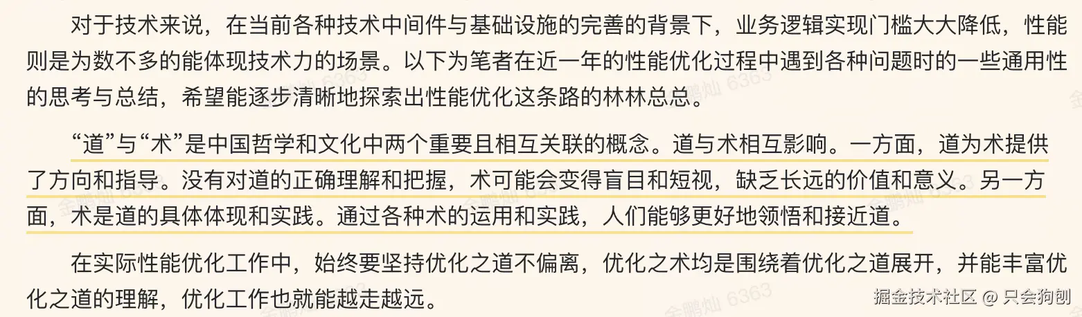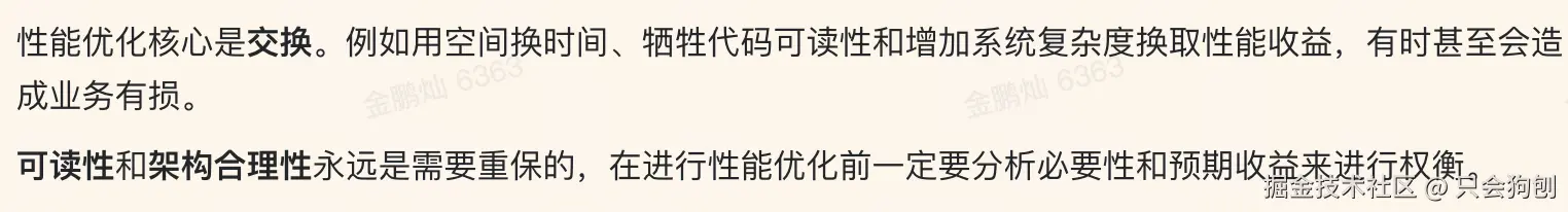 其实代码和性能没有太大关系,即便是反复缠绕、混乱不堪的代码,也只是让人难以读懂,但若其整体架构合理、链路合理,就基本不会造成什么性能问题。而上文所说的一些优化方向,在写出优雅且合理代码时,自然而然就不存在劣化风险,也就不需要什么待优化了。比如开发写代码时多思考下需要日志和metrics来干嘛,就可以避免胡乱加日志、无限制加metrics;比如在技术方案设计时多了解代码现状和上下游逻辑,就可以避免接口重复调用、冗余调用。