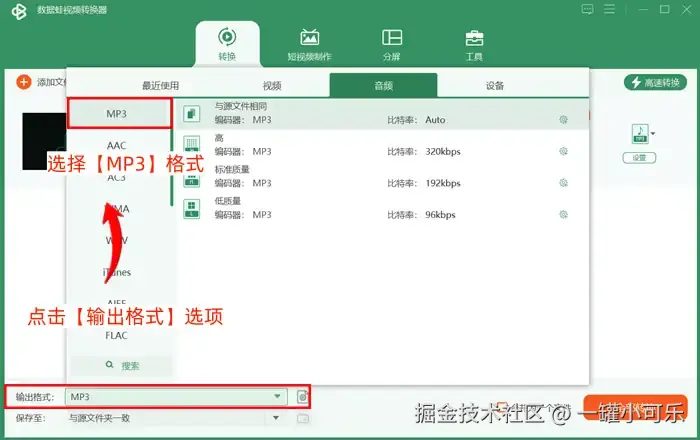 步骤2:点击【输出格式】选项,打开音频格式选择窗口,点击选择【MP3】格式。
