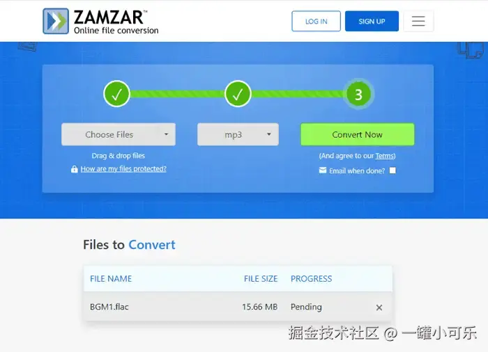 Zamzar是flac转mp3在线转换免费版,用户可以直接将flac文件上传到该网站界面上,然后根据其界面的操作提示即可快速完成格式转换。但是Zamzar的格式转换免费功能有限,仅支持200M以内的文件转换,超过200M就需要支付一定的费用。