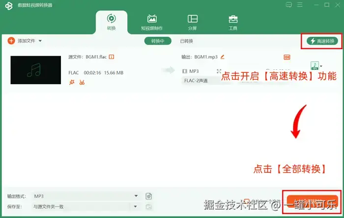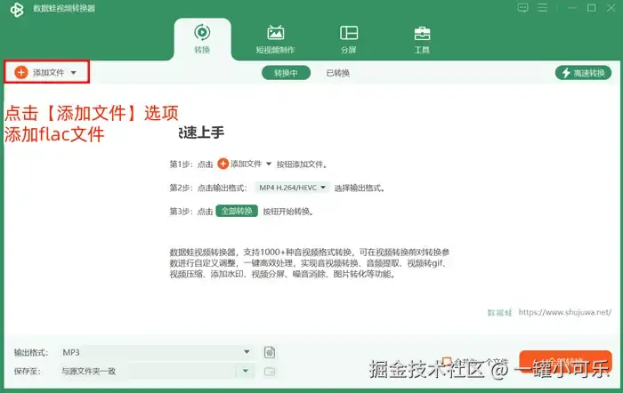 对此,小编推荐大家选择数据 蛙视频转换器。数据 蛙视频转换器设置了高速转换的功能,开启这个功能,可以最大程度上无损加速转换音视频格式。 这个工具还兼容Windows和Mac系统,支持批量转换音视频格式。下面就为大家介绍如何使用这个工具将flac格式转换为MP3格式。