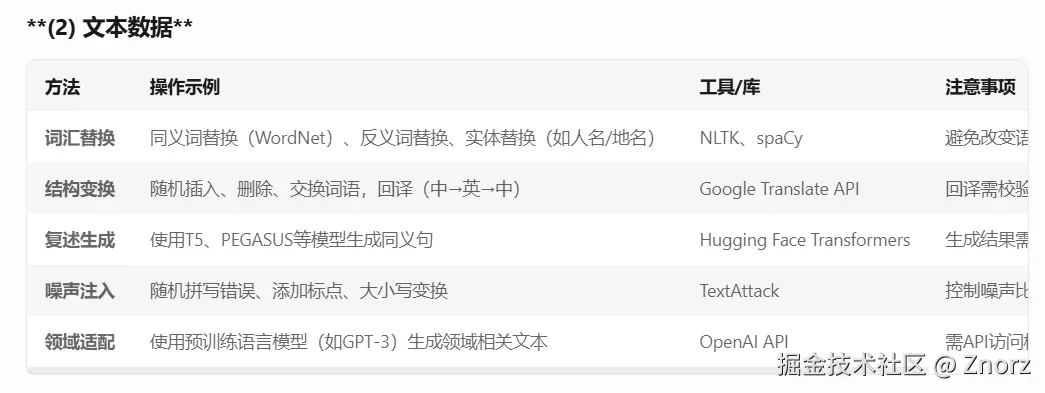 如果是图片数据,可以通过顺时针或者逆时针旋转一个小角度得到新数据,或者上下左右各平移1个像素得到新数据。如果是文本数据,可以通过回译的方法得到新数据,比如中文到英文到中文。但是回译有可能出现翻译错误的情况,因此不太推荐。或者调用api, 把原数据一条条让AI保持意思不变,换一个说法。