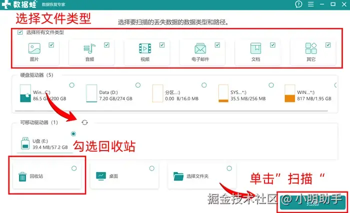 步骤1:打开这款软件后,选择需要恢复的文件类型后勾选回收站,选择完毕后点击“扫描”;
